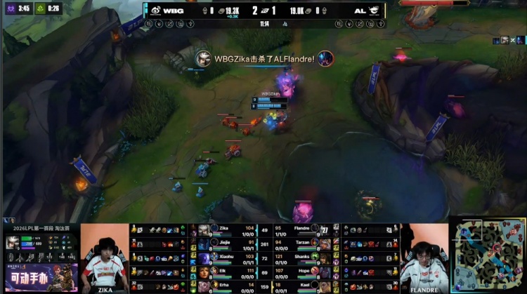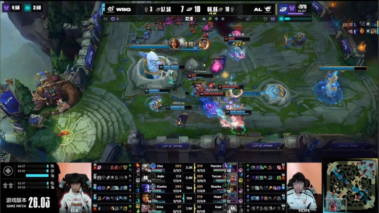 中期WBG三人下路越塔击杀王杰韦鲁斯,AL同时越塔击杀Zika卡蜜尔,双方打出1换1。AL拿到先锋并急速听牌电龙魂,双方经济持平。