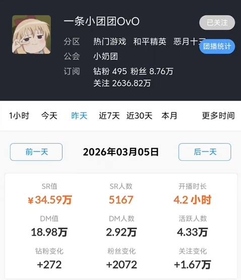 直播吧3月6日讯 昨日晚间,斗鱼女主播“小团团”时隔许久再次开播,根据数据网站显示本次小团团开播时长4.2个小时,付费打赏收入约在34.59万!