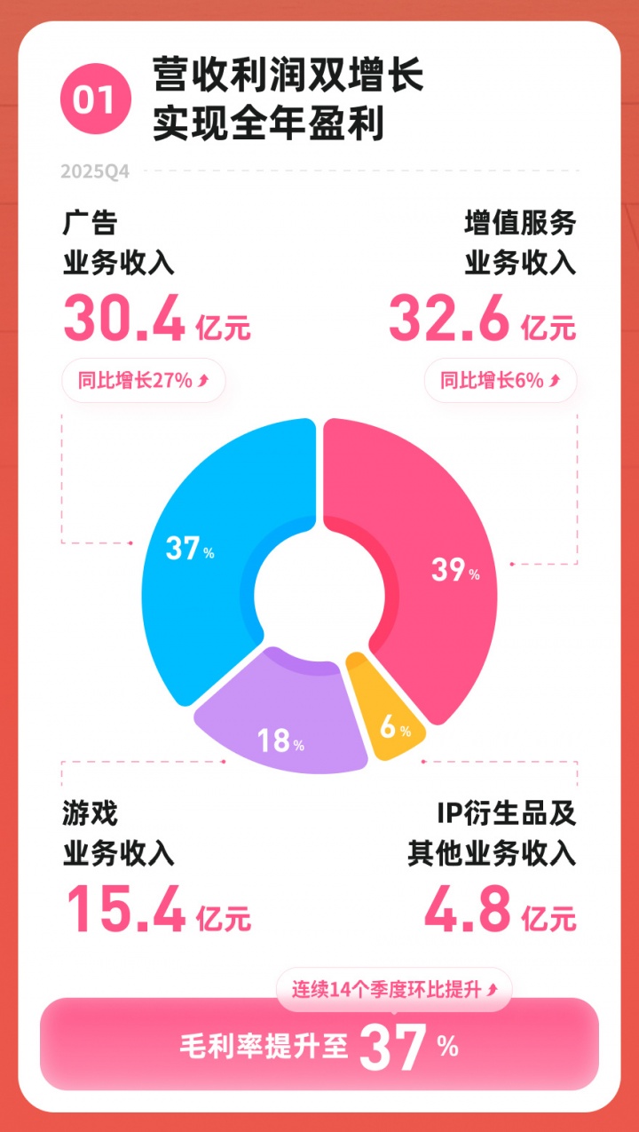 财报中还提到,B站自研游戏《逃离鸭科夫》上线三周销量超过300万,登顶2025年国产游戏销量排行榜;在B站游戏长线运营的策略下,《三国:谋定天下》连续9个赛季在更新后稳居iOS排行榜前五。而《Fate/Grand Order》《碧蓝航线》等游戏的收入也仍然保持稳定。