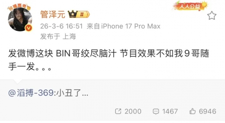 直播吧3月6日讯 今日TES官方公告发出后,369更新动态,对此LPL解说管泽元进行转评,具体如下:发微博这块,BIN哥绞尽脑汁,节目效果不如我9哥随手一发。。。