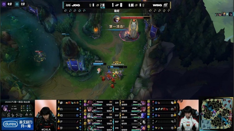 第一局前期,Junjia赵信来到下路配合队友捅飞Elk卡莎,GALA伊泽瑞尔率先拿到一血。随后小龙团JDG打出1换2拿到小龙。紧接着Xiaohu瑞兹开车带Jiejie蔚来下路逮捕GALA,Elk卡莎拿到人头。WBG经济劣势1k。