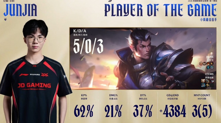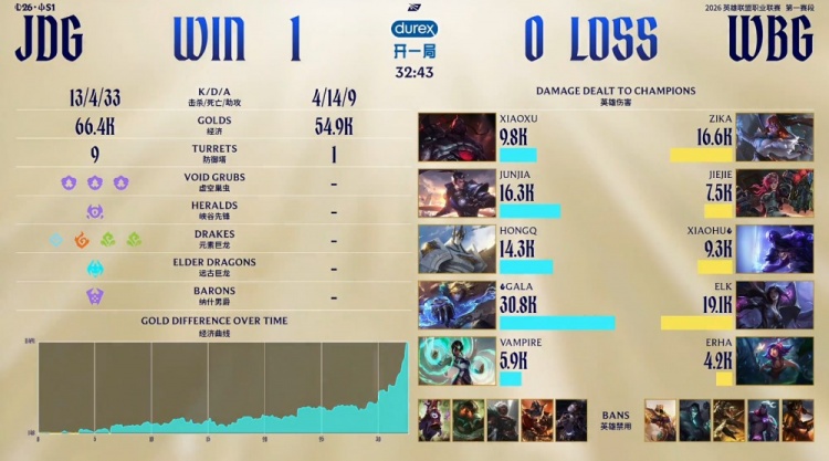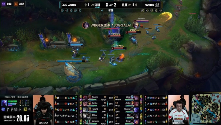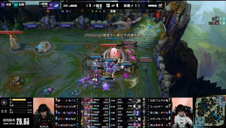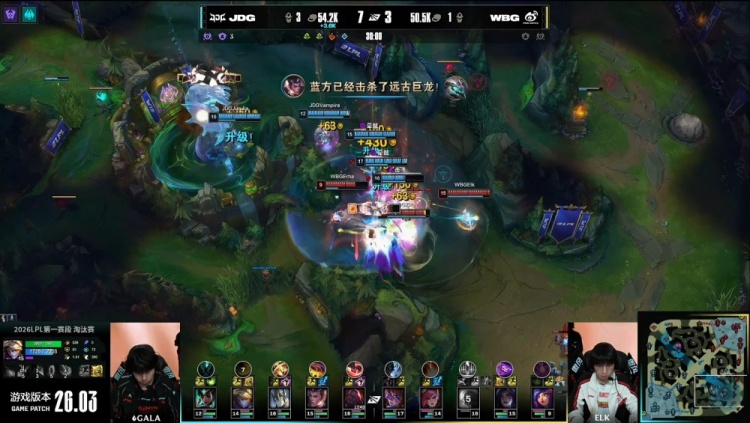 后期Junjia赵信在下路三角草捅飞Xiaohu瑞兹,Junjia回头拿到远古龙,GALA进场双杀,JDG以1换3经济领先5k。最终JDG吃掉大龙后,七龙珠加持推平WBG基地先下一城。