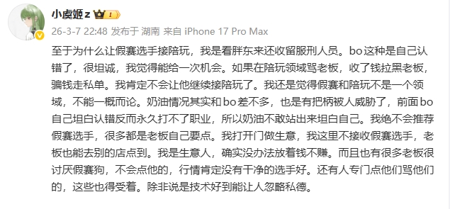 如果在陪玩领域骂老板,收了钱拉黑老板,骗钱走私单。我肯定不会让他继续接陪玩了。我还是觉得假赛和陪玩不是一个领域,不能一概而论。奶油情况其实和bo差不多,也是有把柄被人威胁了,前面bo自己坦白认错反而永久打不了职业,所以奶油不敢站出来坦白自己。
