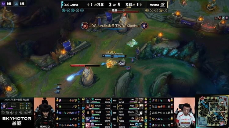 【20:40】小龙团,V神萨勒芬妮开大控住xiaohu狐狸,JDG四人集火将其秒掉,Elk飞机反手打掉HongQ,正面混战,Junjia猴子拿到小龙,WBG三人追击,Jiejie潘森跳大残血落地被V神击杀,GALA艾希反杀Zika安蓓萨,Erha与Elk被堵在JDG野区遭JDG三人集火带走,JDG打出1换5团灭WBG,经济领先2k。