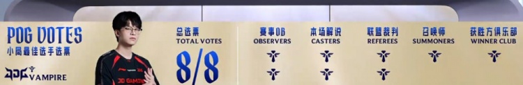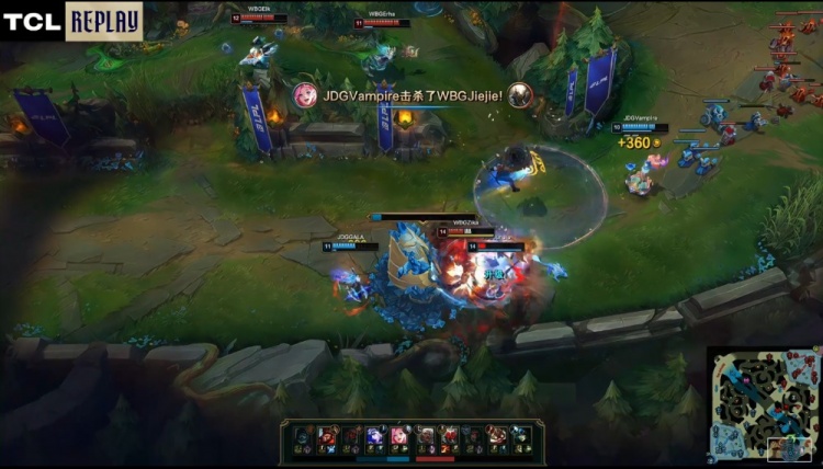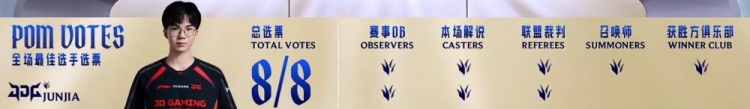 后期JDG入侵WBG野区,WBG打出0换3回头拿到大龙经济领先1k。龙魂团,V神萨勒芬妮开大击中WBG三人,JDG瞬间打出0换4一波推平WBG基地杀死比赛拿到胜利,晋级决赛的同时,同时晋级全球先锋赛!