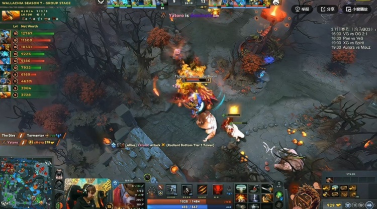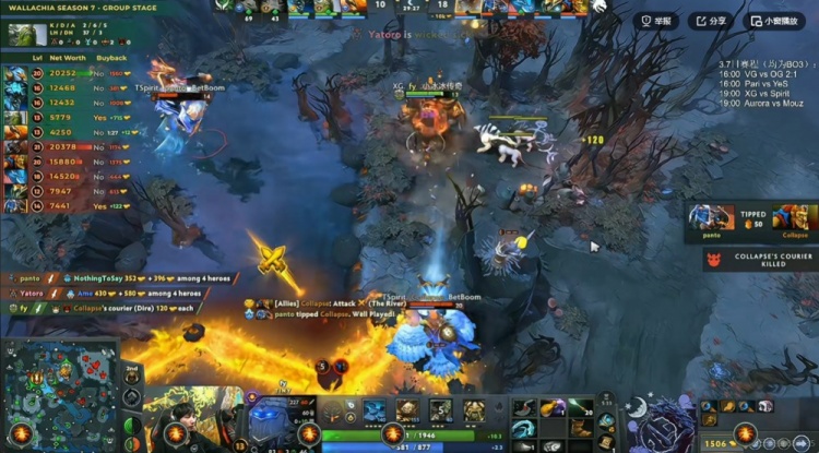 29分钟肉山团,Fy小小先手V两个但是Collapse蝙蝠立功拉住了Ame凯+NTS蓝猫!Spirit将XG双大哥击杀之后打出1换3赢下团战,回头再拿二代肉山!Yatoro拍拍继续带盾!经济差15K了啊!