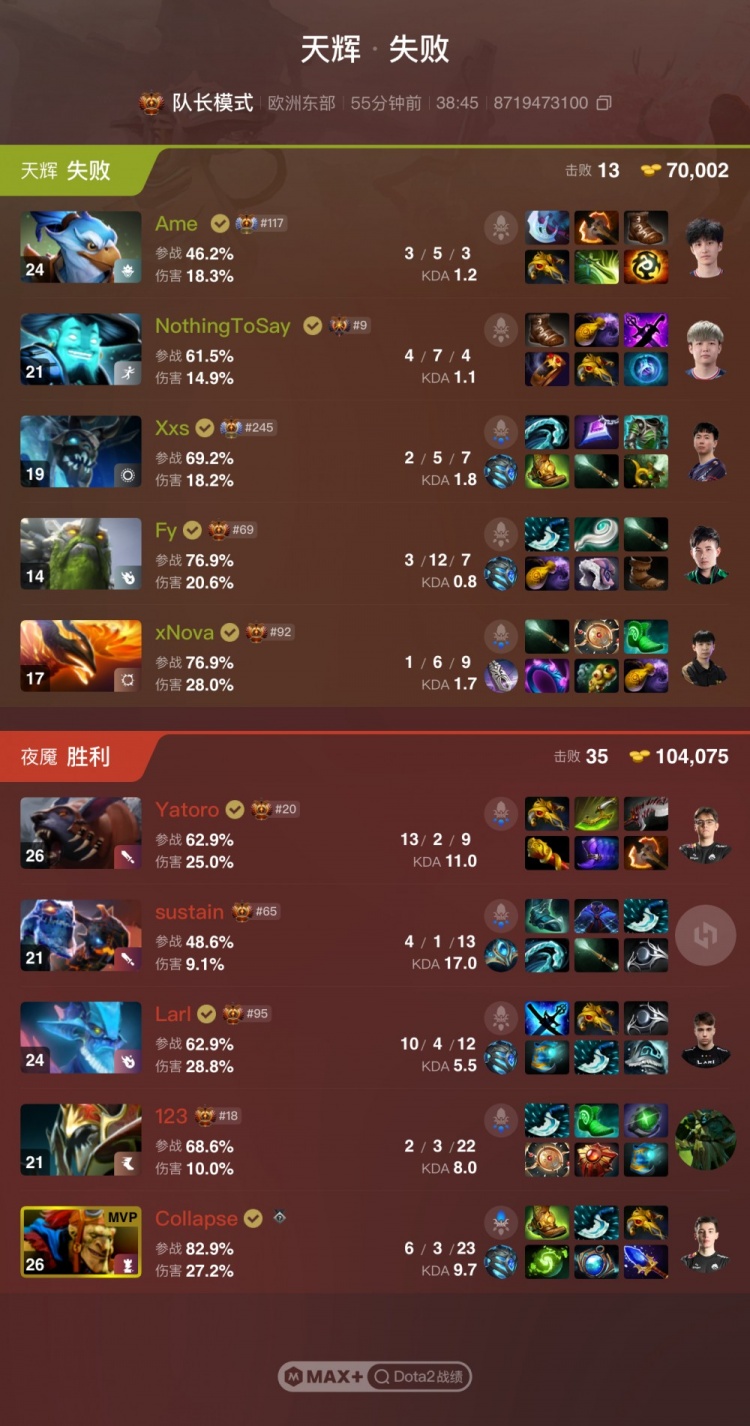 夜魇Spirit:Collapse蝙蝠骑士、rue司夜刺客、panto杰奇洛、Yatoro拍拍熊、Larl拉席克