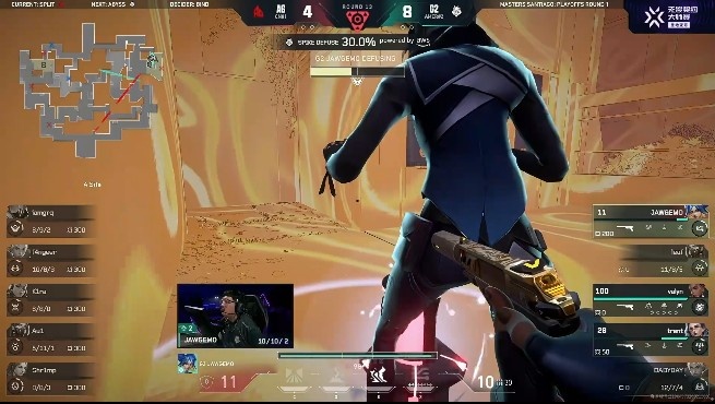 第十一局:G2默认拿到信息后选择打B点,AG放点回防成功架住G2中和B大多人,AG拿下一分!