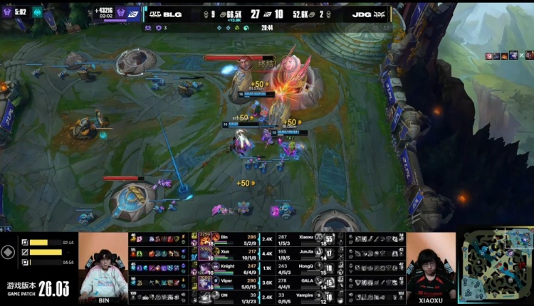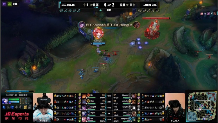 【15:53】上路团战,Xun波比直接壁咚徐神杰斯,徐神杰斯打残Xun后BLG上野拉开,中路JDG双人组送左手辛德拉双杀,Junjia皇子火锅扣人被Viper融化,BLG打出0换3。