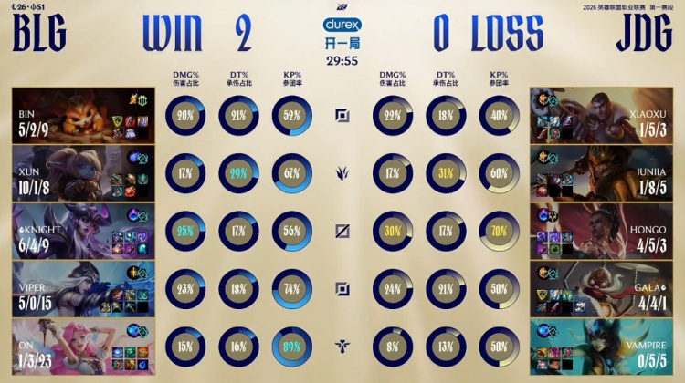 第二局前期野区3v3,HongQ梅尔送左手辛德拉一血。随后上路1v1徐神追击Bin上当,左手支援帮助Bin反杀徐神。BLG吃掉第一条小龙,但被JDG打出1换2。随后下路3v3,Junjia皇子火锅扣ON两次得手,BLG经济领先1.5k。