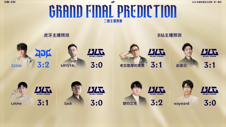 直播吧3月8日讯 今日LPL第一赛段决赛即将正式开打,赛前官方直播间给出了今日的二路解说对于比赛结果的预测。仅有姿态一人看好JDG鏖战五局击败BLG,其余七人均看好BLG夺冠。