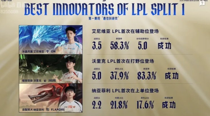 LPL第一赛段最佳科研奖:ON冰鸟、jiejie狼人、Flandre上单狗