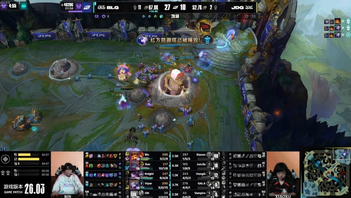 直播吧03月08日讯 JDG 0:2 BLG,上单Xiaoxu再次被Bin爆线,全场隐身0作用,仅在最后自爆拿下一个人头,数据1/5/3。
