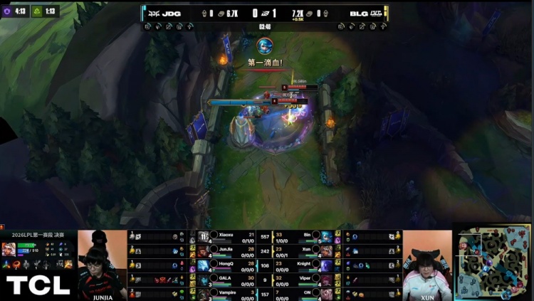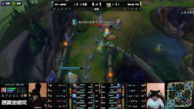 第一局:🎮JDG瞬间爆炸!Bin安蓓萨游龙 Xun怒切GALA BLG杀死比赛赢首局
