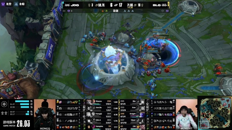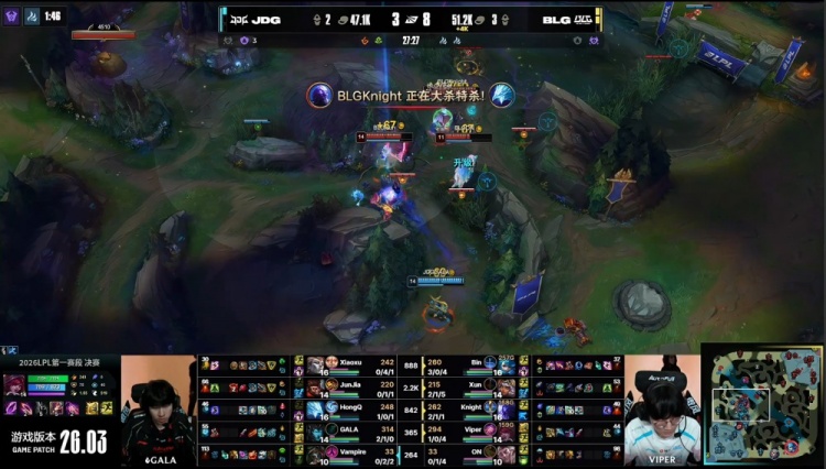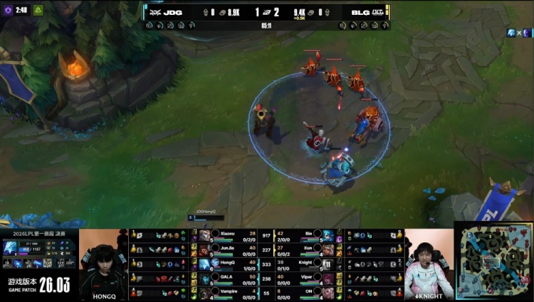 中期小龙团Xun放出先锋撞飞JDG两人,ON洛抬飞JDG两人,Viper霞击杀V神烈娜塔,Bin格温剪穿JDG,BLG打出1换4经济反超3k。