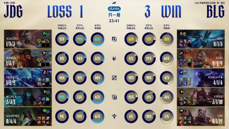 直播吧3月8日讯 2026LPL第一赛段决赛,BLG以3-1战胜JDG,勇夺LPL第一赛段冠军!