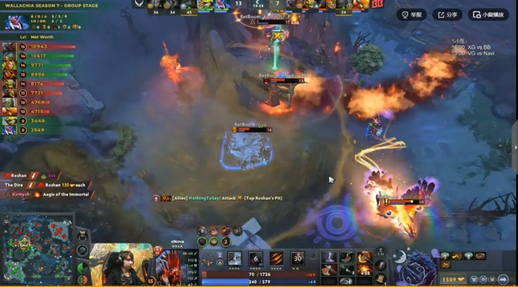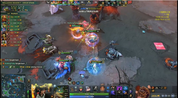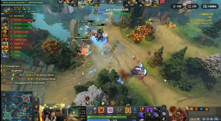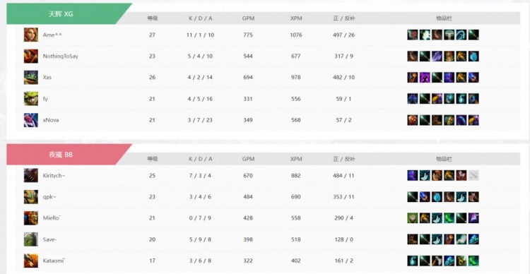 26分钟BB连续扫图逮捕了XG双酱油+NTS火猫,现在领先XG五千经济!30分钟肉山团,XG开雾贴脸打蛋,NTS火猫和凤凰蛋互换,MieRo蝙蝠就拉了一个风行者队友跟不上输出啊!残局Xxs朗戈BKB随便拉扯,Fy松鼠双捆,这波kiritych拍拍+MieRo蝙蝠倒下,XG打出2换4拿下二代肉山!Ame风行者带盾!随后再拿魔晶!