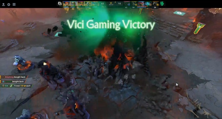 【39:57】VG下路推进,sneyking小y见面就被融化,法老背水一战,Bach玛尔斯无敌框人双杀,VG打出0换3,Sneyking买活死,法老敲出GG,VG扳回一城。