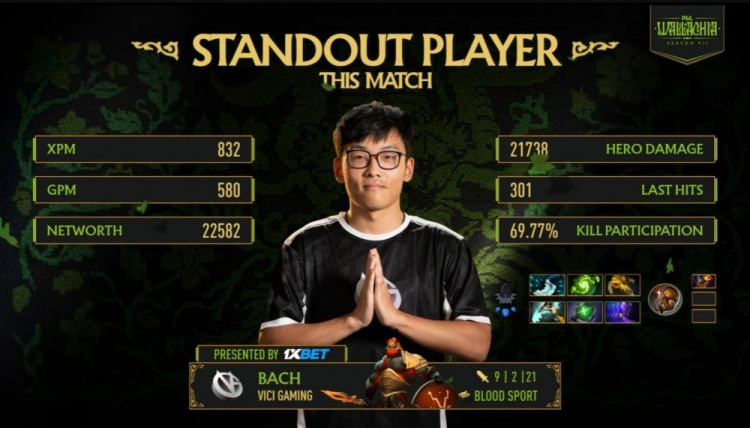 第二局前期,Bach玛尔斯跳刀跳脸联手队友瞬间击杀skiter影魔与Sneyking小Y,随后下路再次跳脸助力Xm小小逮捕ATF滚滚并击杀Cr1t奶绿,VG打出0换4。随后法老野区反打,lorenof蓝猫进场双杀后拉住Bach,法老打出1换4,lorenof蓝猫经济跃升全场第一。