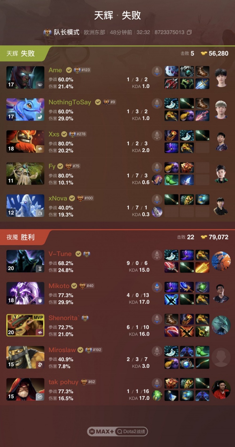 天辉XG:Ame恐怖利刃、NothingToSay帕克、Xxs马尔斯、Fy大树、xNova冰魂