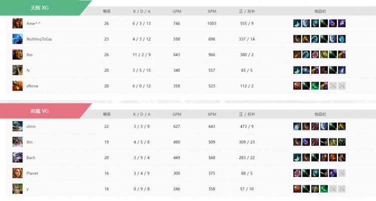 天辉XG:Xxs蝙蝠骑士、Fy暗影萨满、xNova凤凰、Ame兽王、NothingToSay剃刀