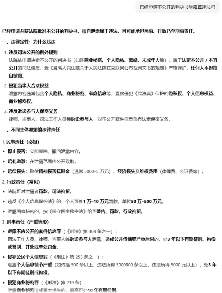 而该判决书申请了未公开,根据豆包显示,该分析师泄露未公开的判决书处于违法行为,可能需要承担民事、行政乃至刑事责任,后续当事人也删除该条微博内容。