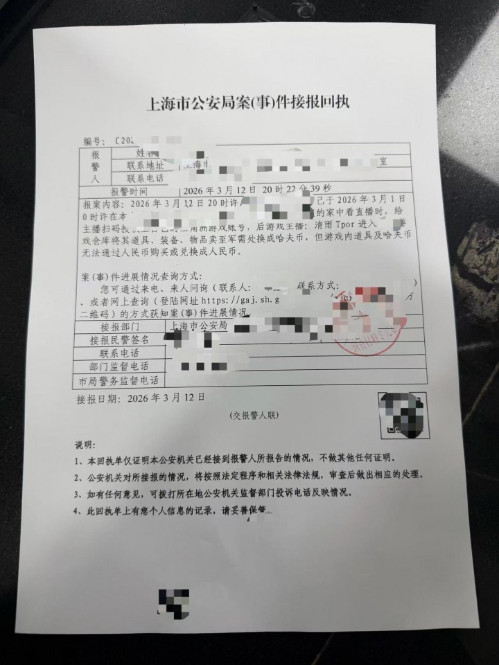 据上海市公安局案(事)件接报回执显示,受害玩家报称,其游戏账号被主播“清雨”登录后,账号内的道具、装备、物品被大量变卖并转换为游戏内货币。尽管游戏内道具无法直接兑换人民币,但这些虚拟资产对于玩家而言具有极高的经济价值和时间成本,主播此举引发了全网玩家的强烈愤慨。