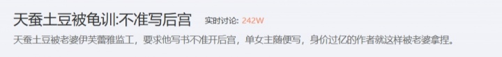 近期,社交平台流传一种猜测:天蚕土豆在与伊芙蕾雅结婚后,遭到了妻子的严格“监工”,被明确要求不准再写后宫文,必须坚持单女主。传闻称,正是这种家庭压力导致了《大主宰》后期及《元尊》、《万相之王》感情线风格的剧烈转向。