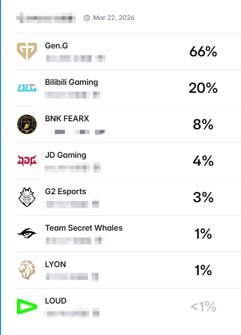 直播吧3月15日讯 外网预测先锋赛各队夺冠概率,GEN以66%高居榜首,BLG以20%排在第二,BFX只有8%,JDG更是只有4%,剩余各队中G2则是3%,越南TSW和Lyon仅1%,LOUD低于1%。
