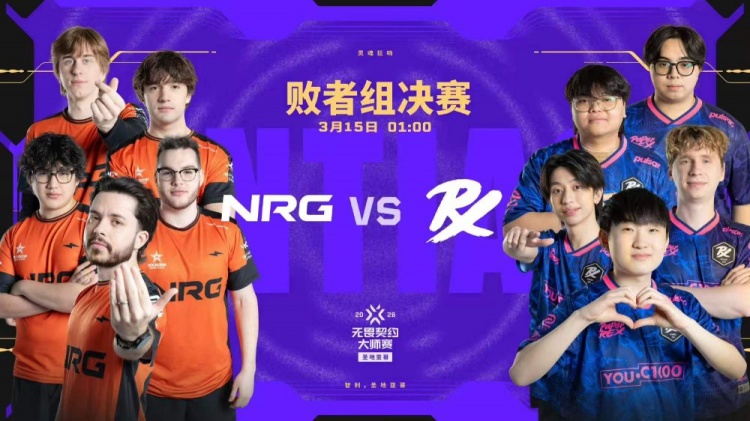 直播吧3月15日讯 2026无畏契约圣地亚哥大师赛本场比赛是由NRG对阵到PRX,败者组决赛谁能攻克强敌晋级决赛直面NS,让我们一起期待!
