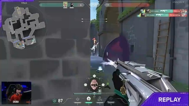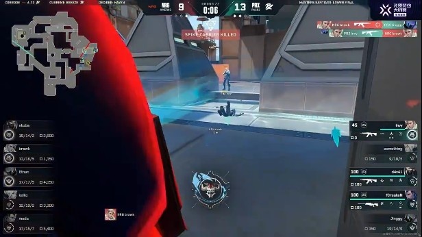 第十一局:双方开局在中路打出1换1,随后PRX在B点前点被NRG逮到了,NRG直接直架包点成功收下PRX多人拿下一分!