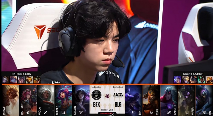 BFX:上单Clear、打野Raptor、中单VicLa、下路Diable、辅助Kellin