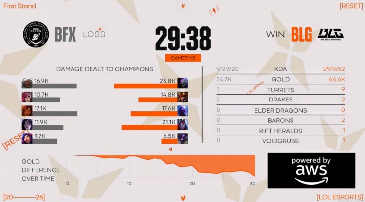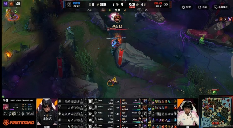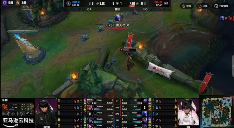 首局比赛knight瑞兹开局两分钟不到对位单杀VicLa岩雀拿下一血!随后Bin贾克斯上路配合Xun皇子也逮捕了Clear安蓓萨!上路对线优势Bin一点情面不给,完成对位单杀之后直接无解!中路knight也第二次完成对位单杀!中期BFX虽然拿下小龙,但是关键团BLG逮捕Raptor蔚之后一波越塔团灭BFX奠定优势!最终BLG拿下两条大龙,Bin贾克斯团战完全游龙,两棒子一个C位解决战斗,BLG中路团一波1换3之后结束掉首局比赛!巨大优势先拿一分!Bin贾克斯则是砍下了11-1的战绩!