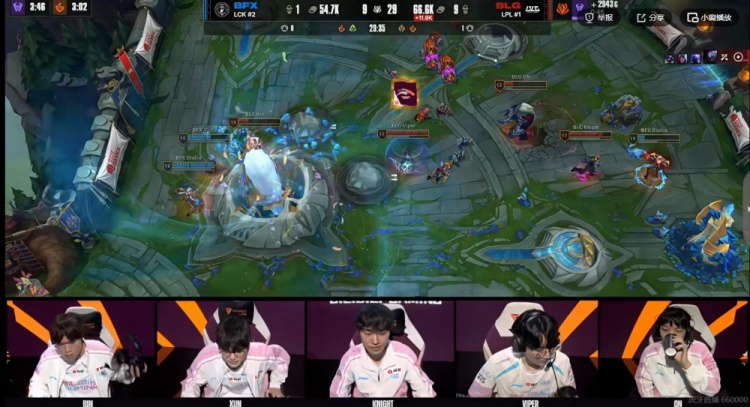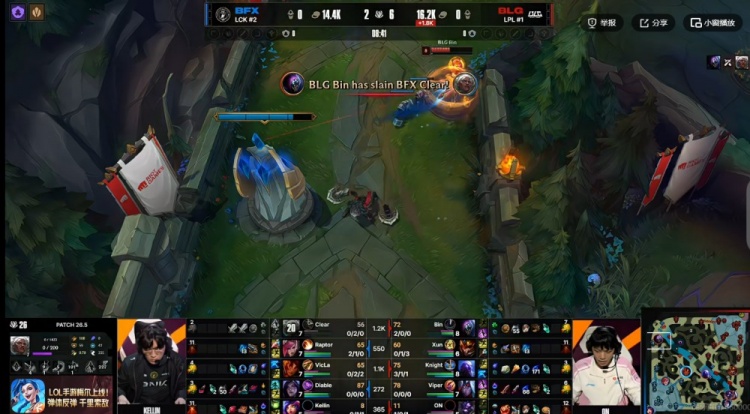 【20:10】BFX四人越塔强杀knight瑞兹,但是BLG支援赶到四打五完全不慌!Bin贾克斯赶着对手后排一打三直接双杀!Xun皇子也留住了想换人的Clear安蓓萨!BLG轻松团灭BFX,回头拿下大龙!9K经济差了!