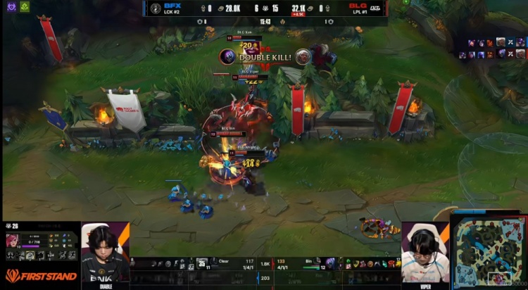 【15:13】Raptor蔚单人三角草排眼直接被BLG四人逮捕,随后BLG直接抱团五打四越塔!knight瑞兹开车三人包后,Viper维鲁斯单人切死Diable卡莎,正面Bin贾克斯双杀收尾,BLG打出1换4团灭掉了BFX,随后再拿先锋!BFX则是换掉了第二条小龙!