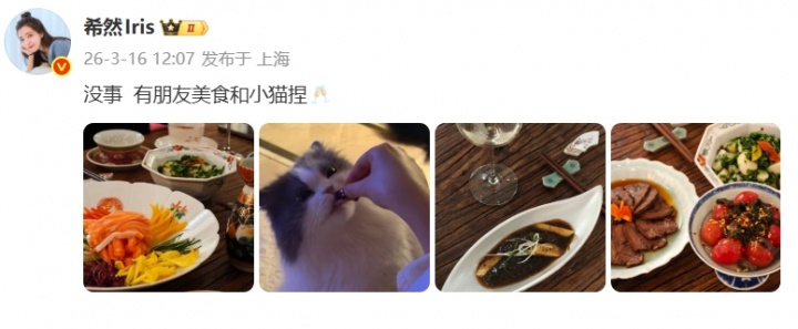 力挺小钰?昨日小钰更新出门聚餐照片 希然今日接力:没事 有朋友美食和小猫捏
