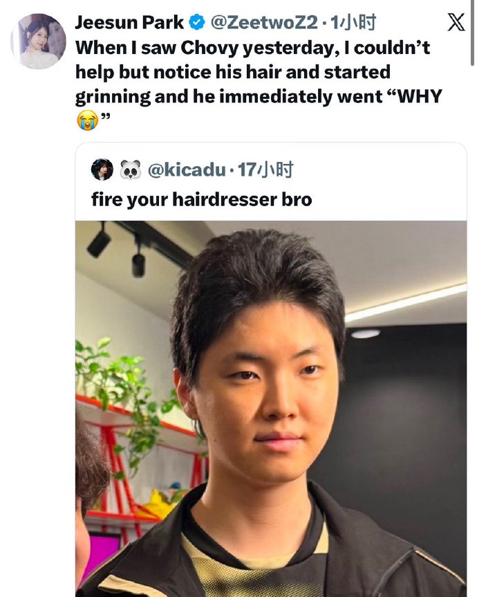 昨天我见到Chovy的时候,忍不住注意到他的头发,然后就咧嘴笑了,他立刻就问“为什么😭 ”。