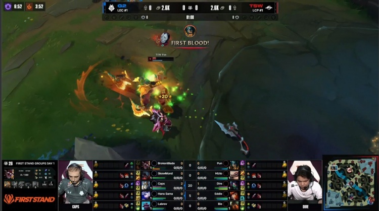 【7:22】Labrov布隆追击到TSW下路二塔前将Eddie女枪单杀,Caps加里奥中路被前后包夹,SkewMond剑魔来正面砍掉Dire,双方打出1换1。随后Bie泰坦下路被G2三人逮捕。