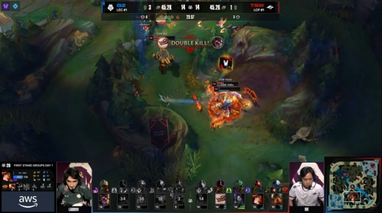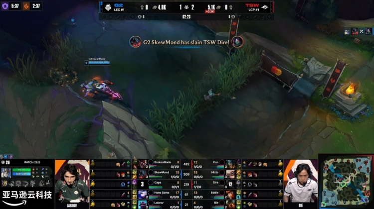 【18:10】SkewMond拿到小龙,G2听牌电龙魂,正面Caps加里奥进场击飞TSW四人后,锤飞Bie泰坦但遭Eddie女枪击杀,Pun奥拉夫正面砍掉Hans Sama艾希,SkewMond剑魔送Hizto冥犬大人头,TSW打出1换4,双方经济持平。