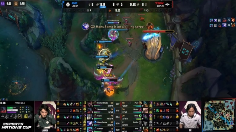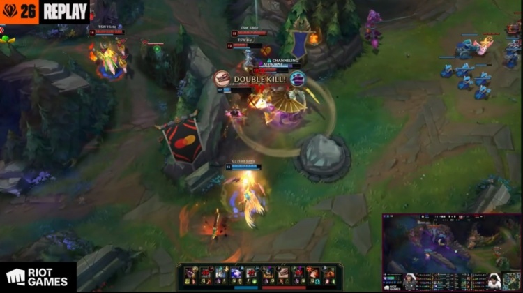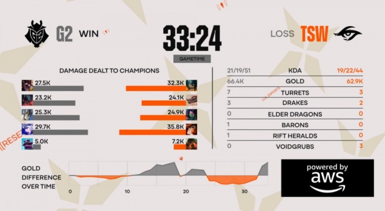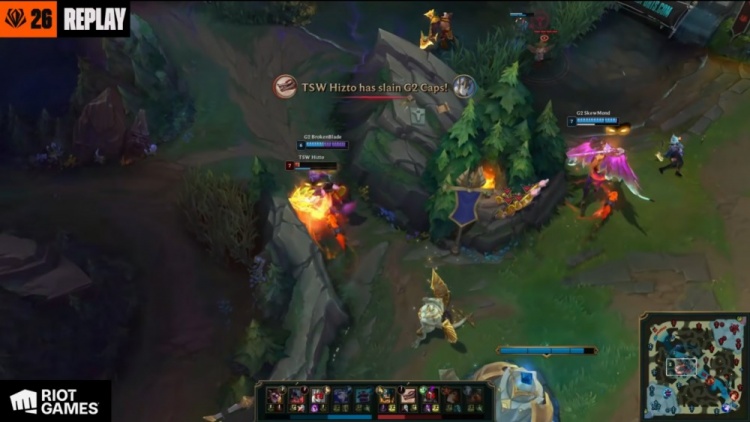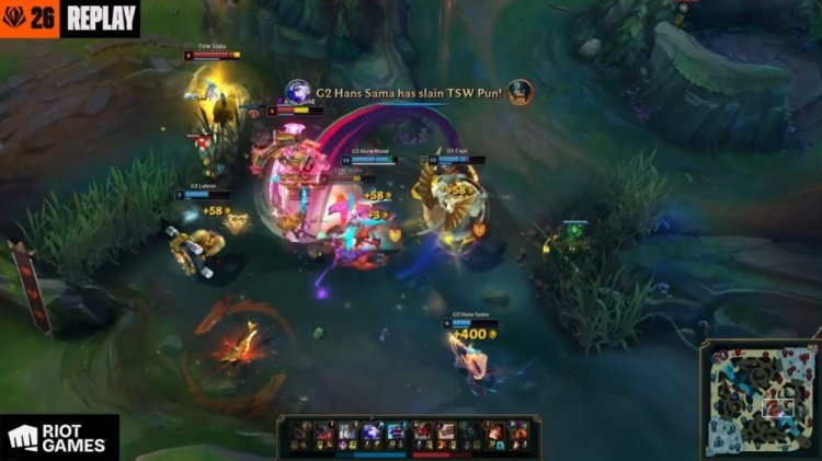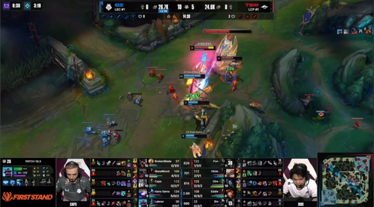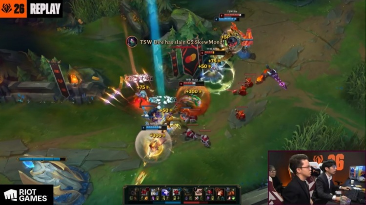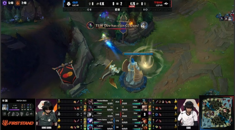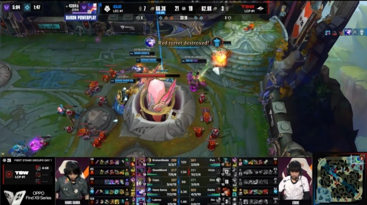 中期G2多次在下路打出优势,Bie泰坦两度被越,Eddie女枪难逃一死,G2打出0换2。小龙团Caps加里奥击飞TSW四人,但遭Eddie女枪击杀,TSW反打出1换4拉平经济劣势。