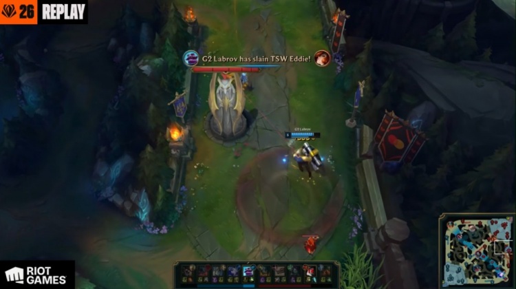 第二局前期TSW中上两路先后拿到对位单杀,下路混战G2打出1换2,Labrov布隆追击至TSW二塔单杀Eddie女枪。