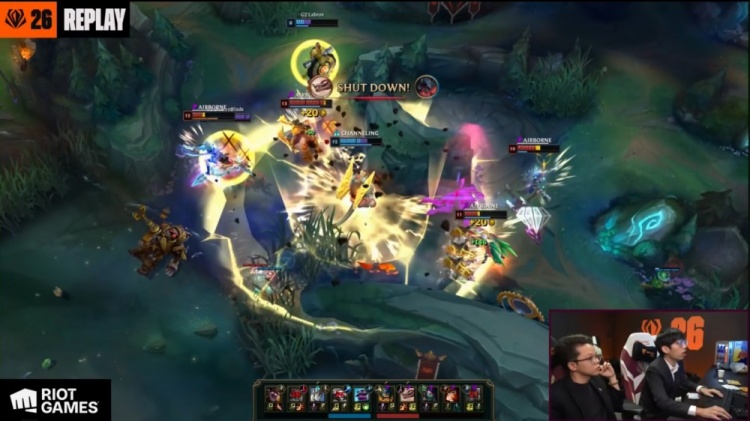 【5:58】下路混战,Dire阿卡丽深入敌后换掉SkewMond剑魔,Labrov布隆也被击杀,随后Labrov复活掏出TP来到正面,G2打出1换2拉开。