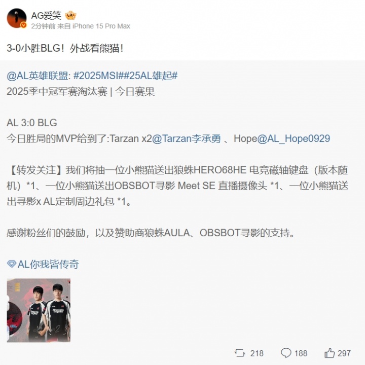 在此前2025MSI败者组中AL击败BLG晋级败决,赛后AL经理更博:3-0小胜BLG!外战看熊猫!