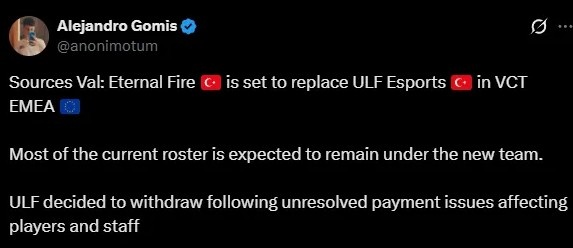 而在ULF退出后,另一家土耳其俱乐部Eternal Fire将接手ULF的席位。Eternal Fire预计将保留ULF原有阵容中的大部分选手。