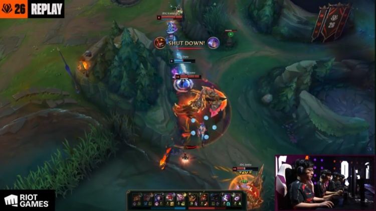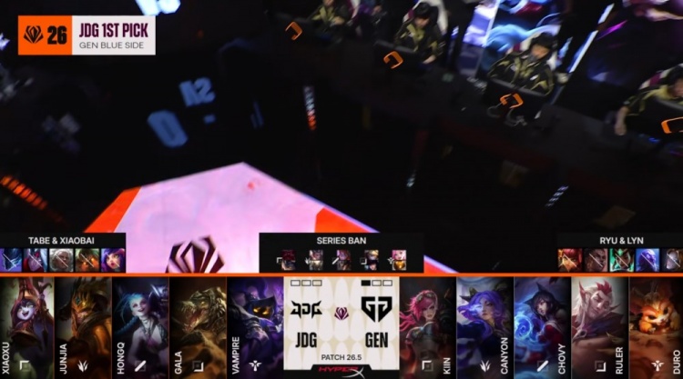 中期Junjia皇子与徐神鳄鱼河道反打0换2,但JDG经济劣势仍然存在2.7k。后续GALA金克丝又被Canyon锁头融化,GEN打出0换3经济领先接近6k。