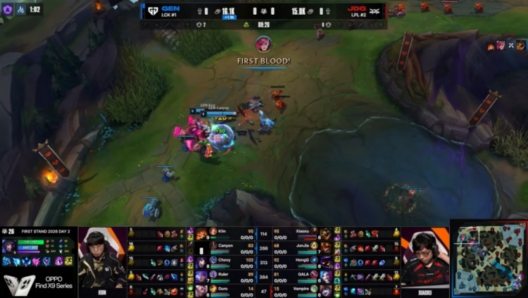 第二局Canyon蔚爽刷之后去上配合Kiin拿到徐神鳄鱼一血,JDG野辅随后赶到击杀kiin,双方上单互换。Junjia皇子随后抢掉小龙,但Chovy妖狐游龙双杀JDG中辅后再贴脸留下Junjia,GEN打出1换3经济领先3k。