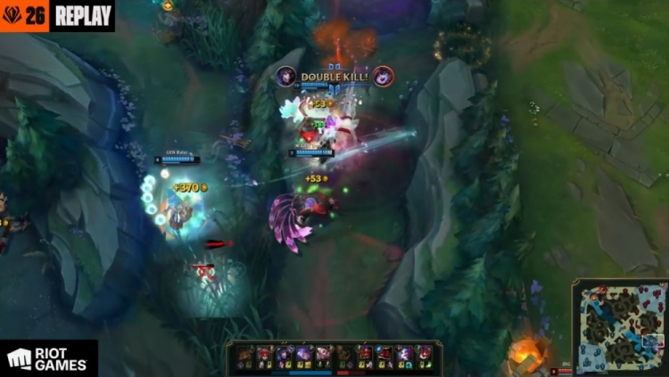 【13:58】Duro洛河道被HongQ小法圈框住击杀,上路徐神鳄鱼开大单吃Kiin纳尔,河道Canyon蔚再锁头GALA拿到人头。