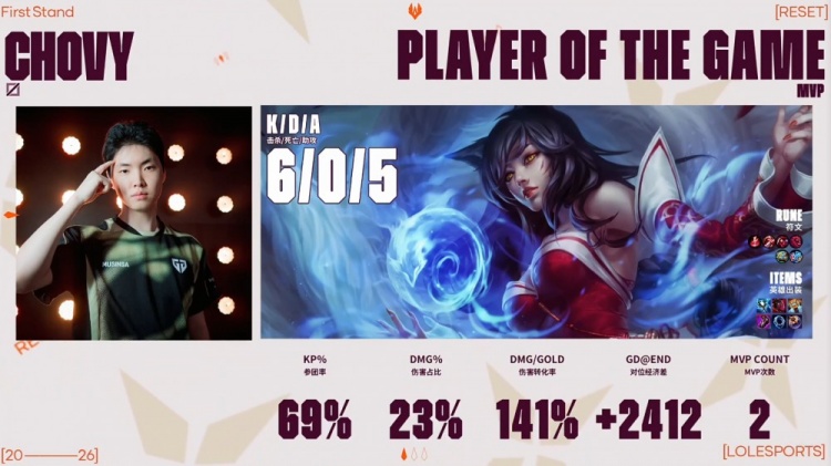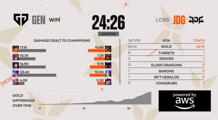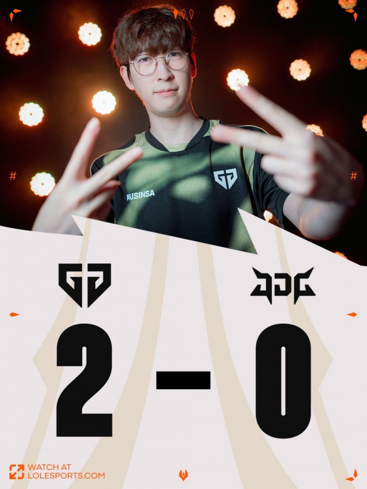后期Junjia皇子追击Canyon蔚反被击杀,GEN轻松吃掉大龙,JDG四人接团再送中上二人,GEN经济优势超过1w。最终GEN中路推进,JDG再次不堪一击,GEN打出1换4一波推平JDG基地拿到赛点。