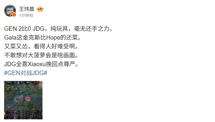 直播吧3月17日讯 先锋赛GEN 2-0 JDG,媒体人王玮晨赛后吐槽: