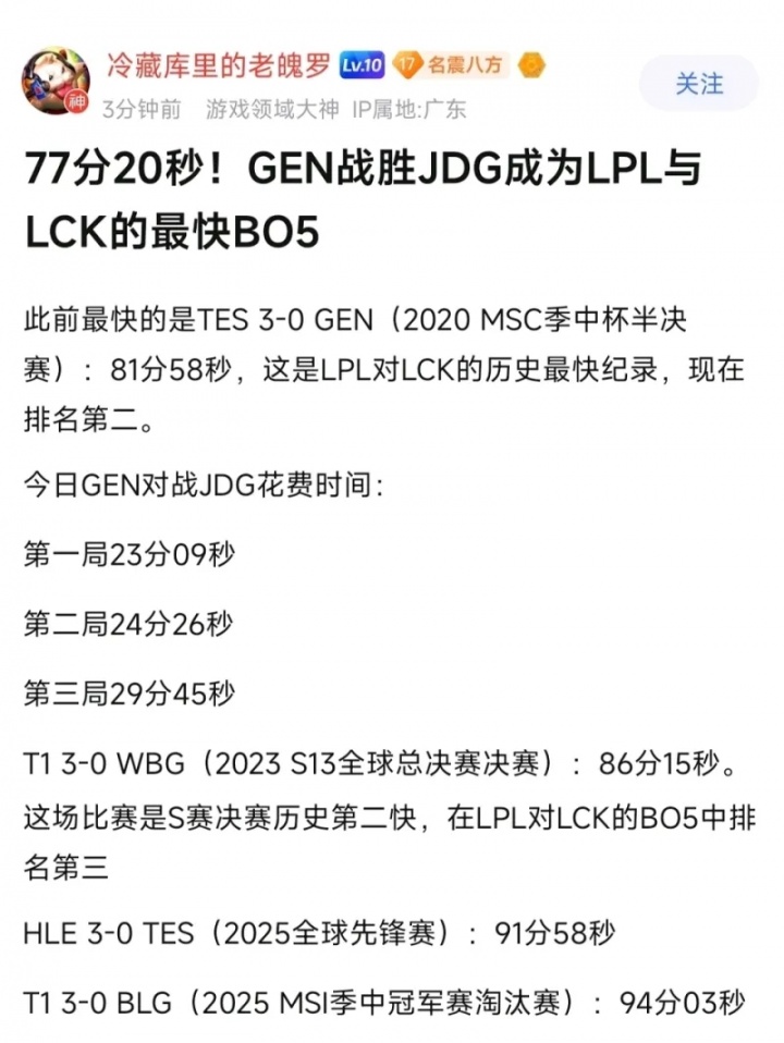 直播吧3月17日讯 在今日的先锋赛小组赛上,JDG以0-3的比分不敌Gen.G,本场BO5用时77分20秒,根据贴吧网友记录本场比赛成为LPL与LCK的最快BO5。